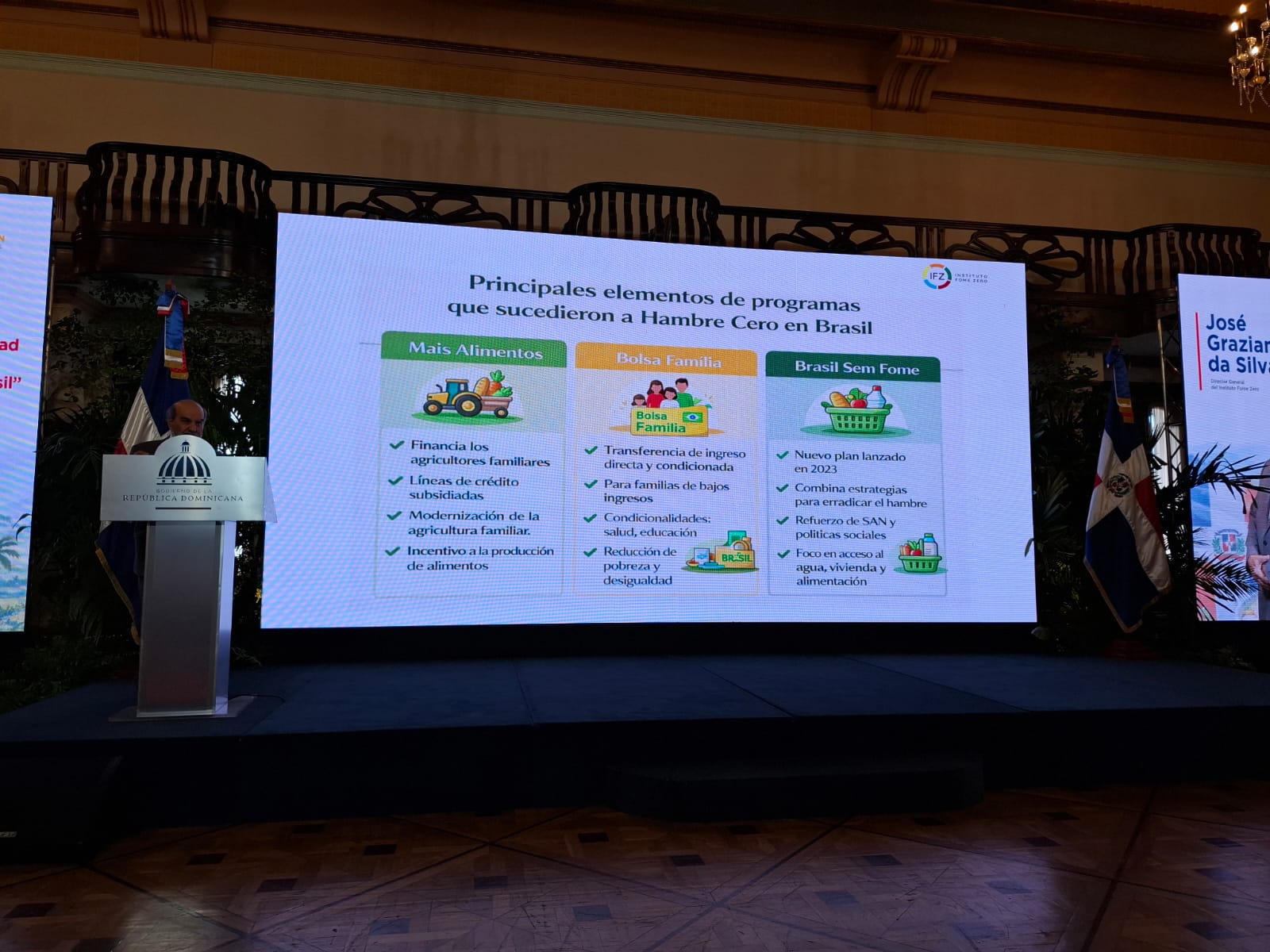En la tercera semana de febrero de 2026, durante un viaje a República Dominicana, el director del Instituto Fome Zero, José Graziano da Silva, se ha reunido con la Ministra de la Mujer, Gloria Reyes, para discutir el programa de protección social anticipatoria de ese país.